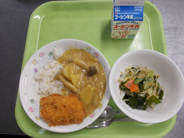 牛乳・駒ヶ根産しめじ入りカツカレー・もやしサラダ です