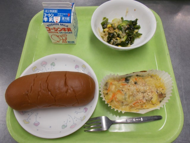 牛乳、ココアパン、じゃがいもとほうれん草のグラタン、大根サラダ です。