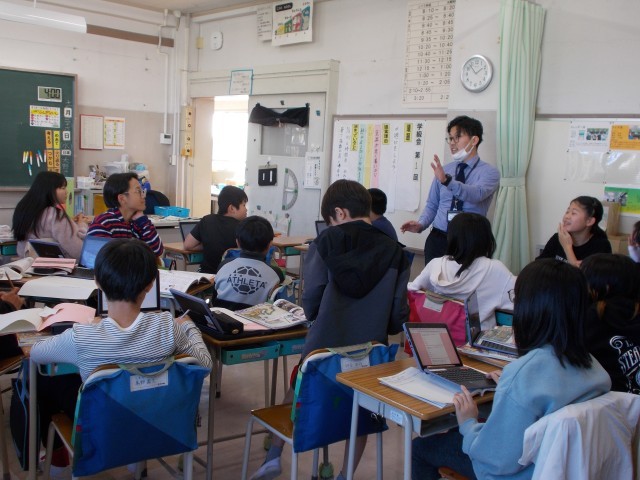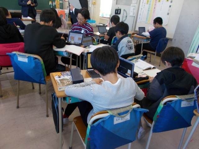 社会「新しい学問と文化」の学習では、子供たち一人一人が江戸文化について課題を設定し、調べ方を工夫しながら学びを進めました。友達や先生からアドバイスを受けると追究意欲を高めながら、内容を深めていました。