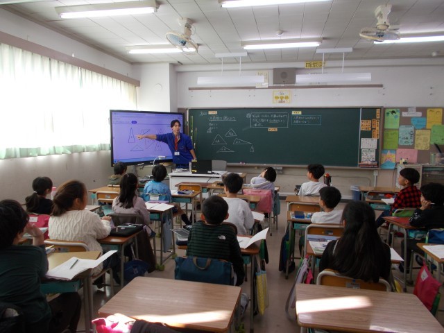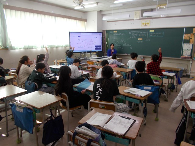 学習のねらいは「二等三角形や正三角形の特徴に気付き、なかま分けすることができる」です。子どもたちは三角形の辺の長さに着目して、なかま分けしました。子どもたち一人一人が自分の考えをもち「二等辺三角形」「正三角形」の意味に触れながら交流しました。自分の考えを積極的に発言するする姿をたくさんみることができました。