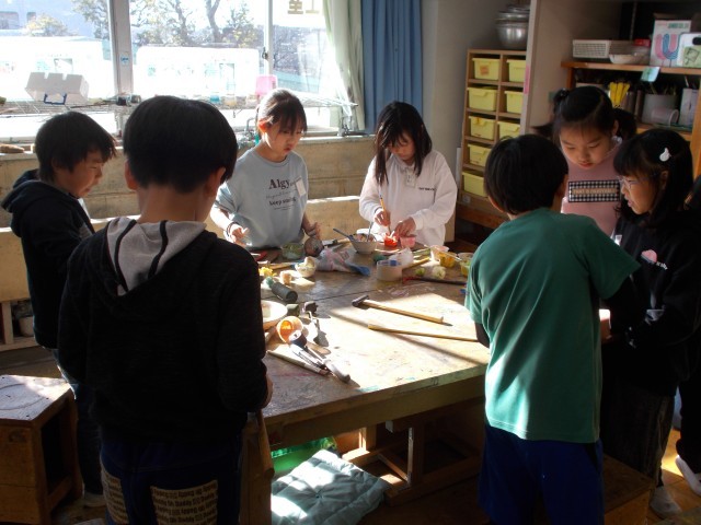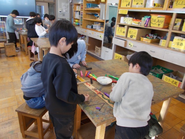 金づちを使い「くぎを正しく安全に打つこと」をめあてに学習しました。板に描いた模様に合わせて、慎重に釘を打ち込み、グループで協力してビー玉の通り道を作りました。最初は慣れない手つきでしたが、徐々にコツを掴み、力加減を工夫する姿が見られました。授業後半の「転がしタイム」では、コースがうまくできているか何度も試すことができました。