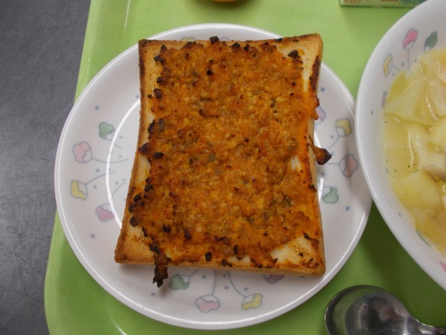 今日は「ボロネーゼトースト」です。このメニューの考案者は、志村小の給食でも色々なトーストが出てきますが、ひき肉たっぷりの「ボロネーゼ」を乗せてトーストにしたら、全校みんなで美味しく食べられるはずという思いで作ったそうです。