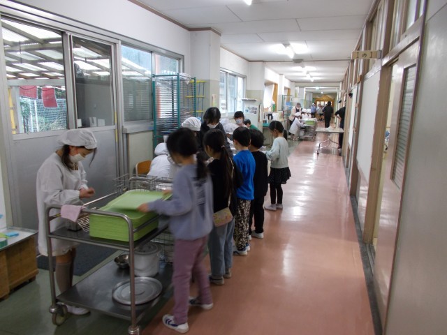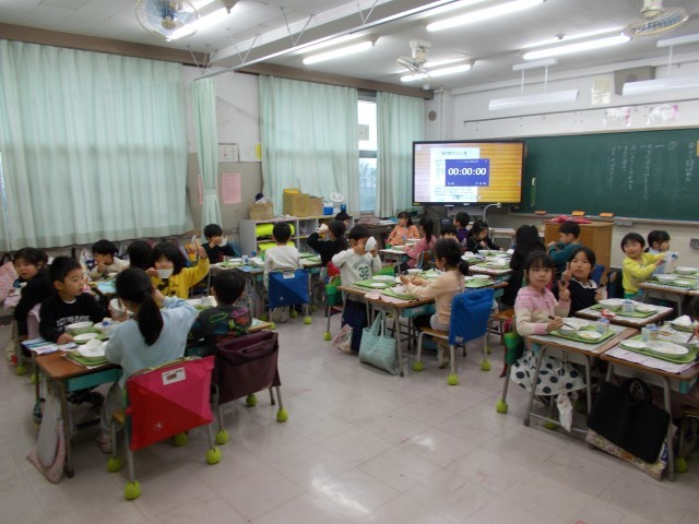 4時間目が終わると、給食当番は白衣を身にまとい、自分たちで準備を進めていました。配膳も上手になり、今日はお肉とスープを見事完食!明るく笑顔で、もりもり食べる姿が、とてもよかったです。