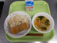 9月26日(金)今日の献立は、あまつっこ給食コーンごはん、ひじきの春巻き、わかめ...