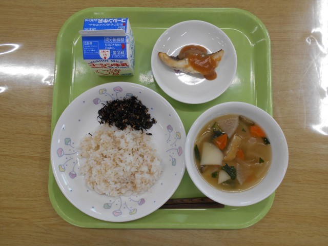 10月3日(金)の給食 公開日 2025/10/03 更新日 2025/10/03 給食献立 【今日の献立】 ・牛乳・ごはん・ひじきふりかけ・魚(ソイ)のみそだれかけ・根菜汁【今日の生鮮食品】・しょうが(高知県) ・にんじん(北海道) ・ごぼう(青森県)・たまねぎ(北海道) ・だいこん(長野県) ・じゃがいも(北海道)・あおな(茨城県) ・さかなソイ(アラスカ)
