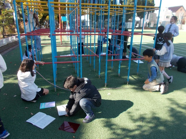 3年生は算数「長さ」の学習で、巻き尺を使って校庭にある遊具の高さや木の回りの長さなど、