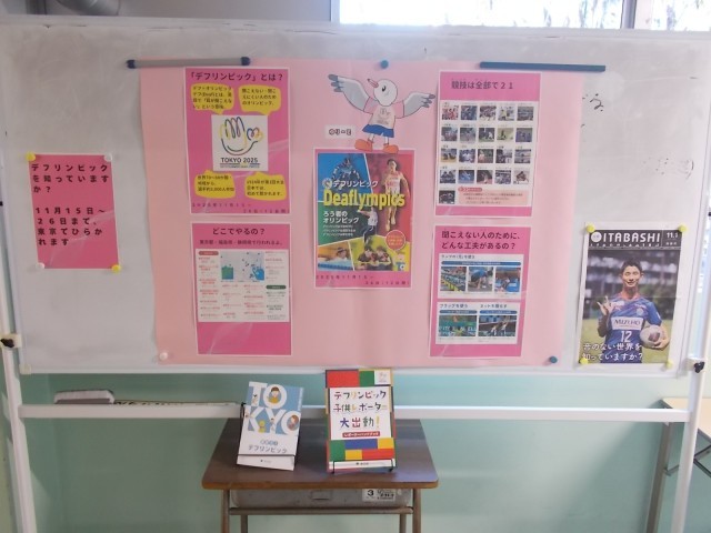 デフリンピック 開催中! 公開日 2025/11/21 更新日 2025/11/21 日記 デフリンピックをご存じですか?11月15日から行われている、耳が不自由な人たちのためのオリンピックです。そのデフリンピックを紹介する掲示を玄関に展示しています。ご家庭でも、ぜひ話題にしていただければと思います。