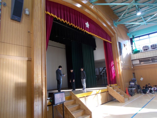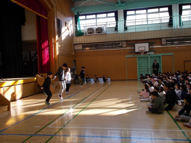なわとびオリンピックで全校1位に輝いたなわとび名人たちが体育朝会で技の披露をしました。