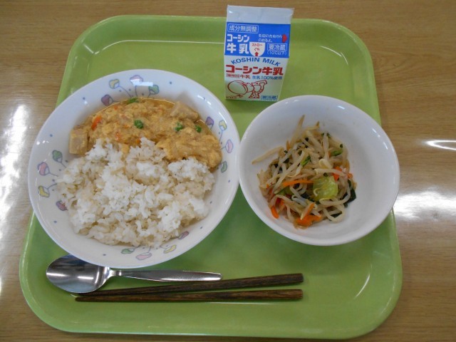 4月22日の給食 公開日 2026/04/22 更新日 2026/04/22 給食献立 ★今日の給食★牛乳変わり親子丼野菜のからし和え★食材の産地★玉葱:北海道 人参:徳島県もやし:栃木県 青菜:茨城県鶏肉:宮崎県