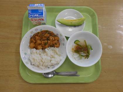 5月31日(水)の給食 公開日 2023/05/31 更新日 2023/05/31 給食献立 <今日の献立> ・牛乳 ・マーボー豆腐丼 ・茎わかめと大根のピリ辛 ・くだもの(タカミメロン) 【今日の生鮮食品】 ・にんにく(青森県)・しょうが(高知県)・にんじん(埼玉県) ・ながねぎ(千葉県)・にら(山形県) ・だいこん(青森県) ・きゅうり(埼玉県)・タカミメロン(茨城県) ・ぶたひきにく(茨城県)