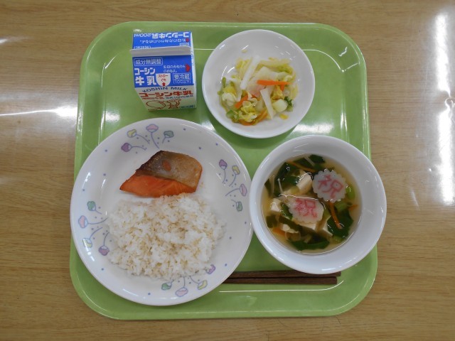 4月17日(木)の給食 公開日 2025/04/18 更新日 2025/04/18 給食献立 【今日の献立】 ・牛乳・ごはん・魚(鮭)の西京味噌焼き・甘酢あえ・お祝いすまし汁【今日の生鮮食品】・にんじん(徳島県)・きゃべつ(神奈川県)・だいこん(千葉県)・ながねぎ(埼玉県)・えのきたけ(長野県)・あおな(埼玉県)・さかな鮭(チリ)