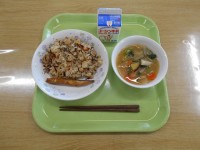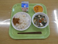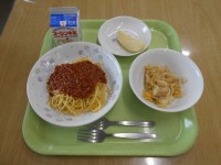 【今日の献立】 ・牛乳・ガーリックトースト・ポークビーンズ・フルーツポンチ【今日の生鮮食品】・にんにく(青森県) ・セロリー(静岡県) ・じゃがいも(鹿児島県)・たまねぎ(北海道) ・にんじん(静岡県) ・ぶたにく(埼玉県・群馬県)・とりガラ(宮崎県)
