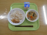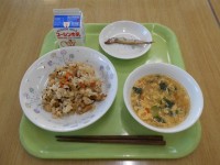 《本日のメニュー》○牛乳○磯おこわ○小魚の香味焼き○かきたま汁