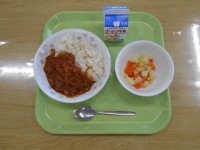 《本日の献立》○牛乳○ビビンバ風まぜご飯○卵スープ○くだもの(りんご)