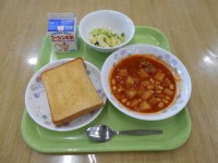 《本日の給食》○牛乳○黒糖ミルクトースト○ポークビーンズ○グリーンサラダ