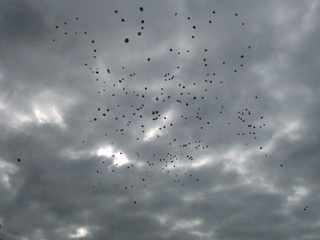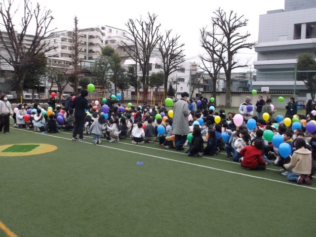 20日(金)の記念植樹式の後に、校庭で風船を飛ばすバルーンリリースを行いました。後藤周年実行委員長の発声で、色とりどりの風船300個が大空に放たれました。周年行事の思い出の一つになりました。
