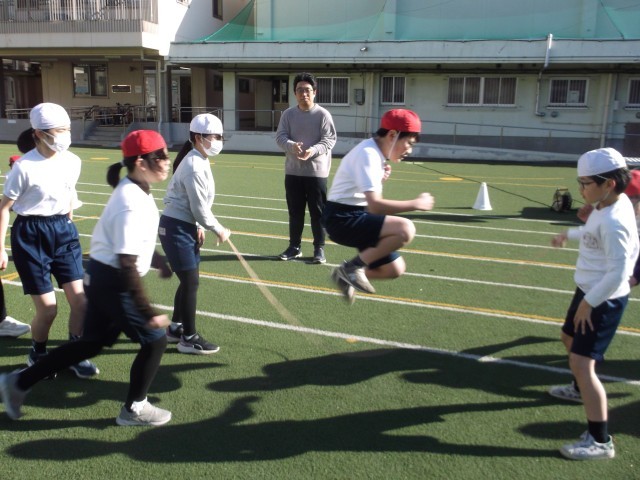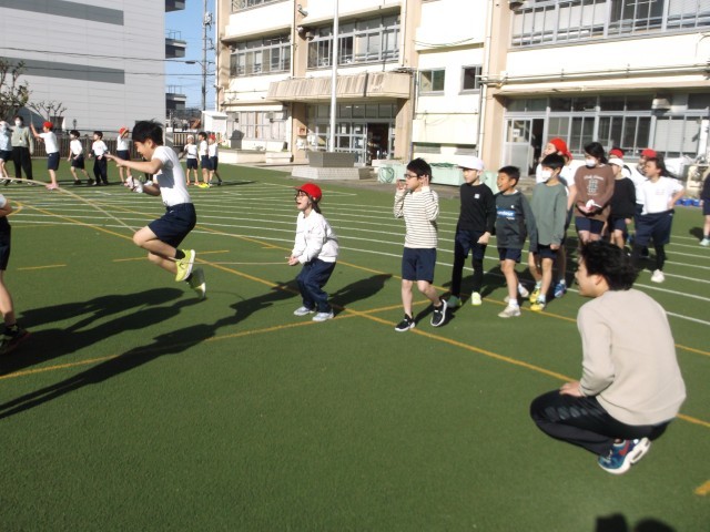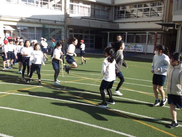 5日(木)に、校内長なわ大会記録会を行いました。冷たい風をものともせず、温かい日差しを受けながら、各学級が8の字跳びの記録更新に挑戦しました。最高回数は6年3組の275回で、前回より56回も記録を伸ばしました。