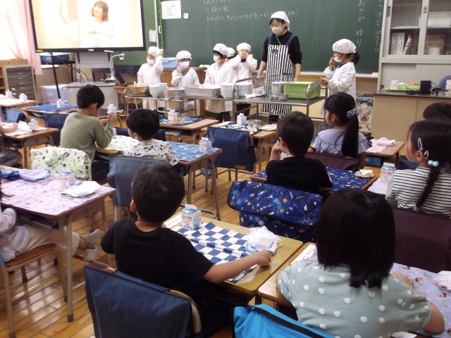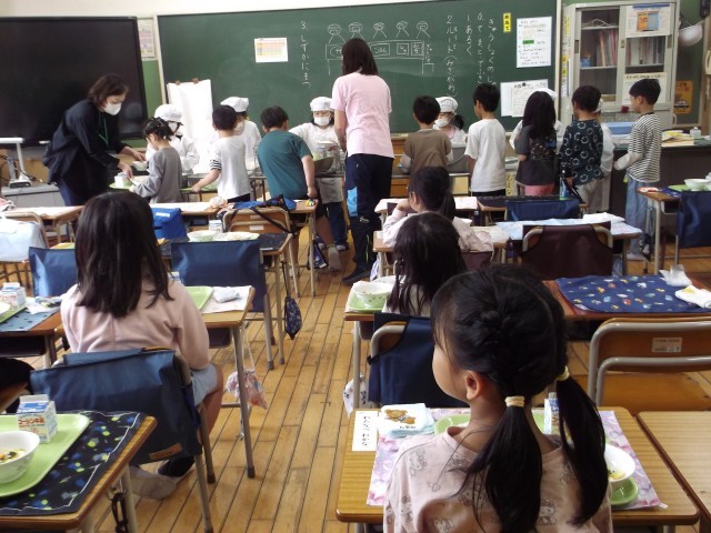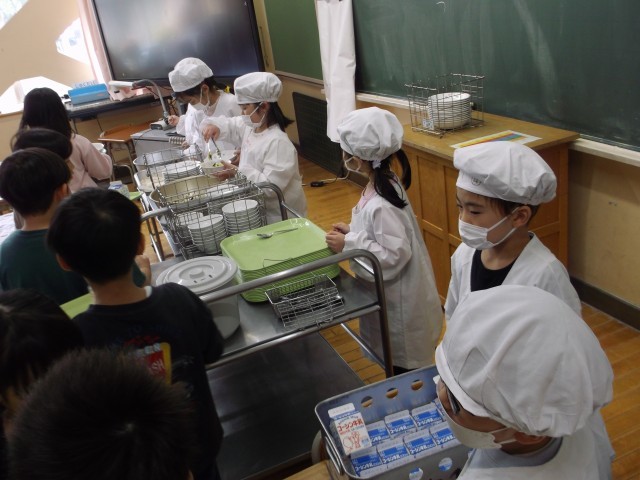 13日(月)は、1年生にとって小学校で初めての給食です。担任から配膳の仕方や、白衣の着方を学んだ後、実際に食器を配り、ごはんをよそり、カレーをかけ、和風サラダを盛り付けて、牛乳と一緒に食べました。