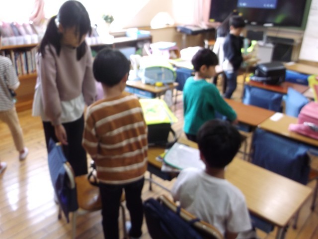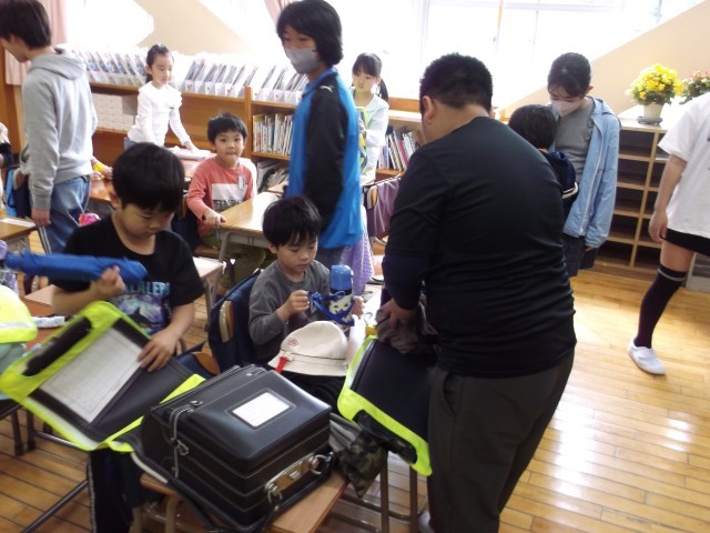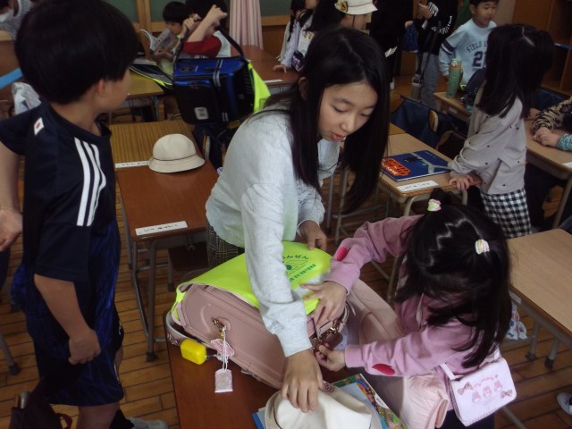 1年生が登校すると、教室で学習の準備をします。当番の6年生が1年生に名札を付けたり、道具箱の整理を手伝ったりしています。