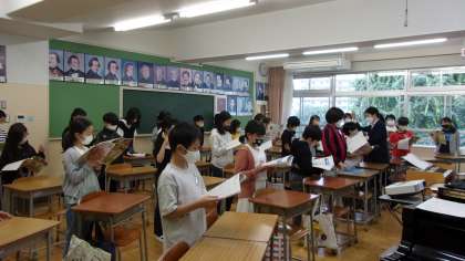 音楽では、5年生が旋律の重なり方の違いや歌詞の内容を生かして、互いの音を聞きあいながら2部合唱に挑戦していました。