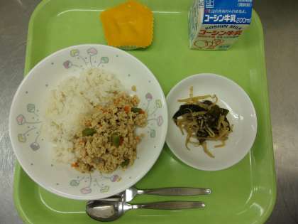 ハロウィン献として、パンプキンケーキを作りました。低学年は残っているクラスもありましたが、高学年は完食してしるクラスがほとんどでした。そぼろ丼には、高野豆腐がたくさん入っています。鉄分が豊富です。