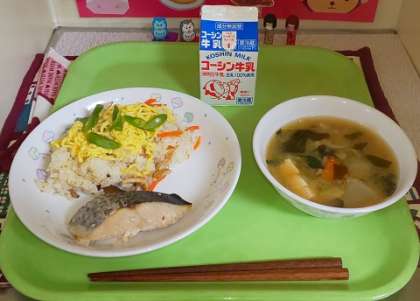 一方、青魚のサワラは苦手な子が多く、担任の先生方ががんばって残菜を減らすべく、せっせと食べているクラスが少しだけ見られました。