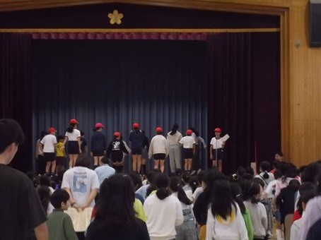 今朝は体育朝会でした。運動委員さんが、全校で出来る楽しい運動を計画しました。