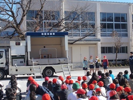 起震車を用いた体験学習を5年生が行い、全校児童の前で5年1組の児童が代表して体験しました。