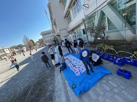 4年生が、4月に行われる「志村ファミリーデー」に向けて、巨大ポスター(旗)づくりに取り組んでいます。