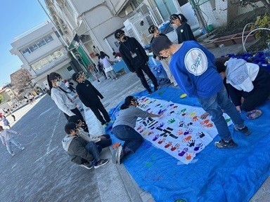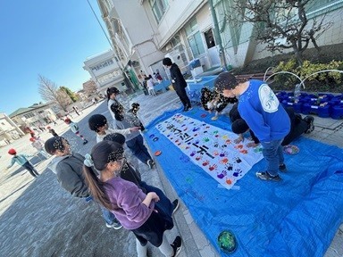 この旗は、地域の方々、志三小の子どもたち、そして地域の保育園の子どもたちの手形を集めて作る、みんなの思いがつまった作品です。校庭に大きなシートを広げ、一人ひとりが楽しそうに手形を押していました。