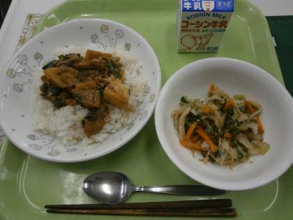 <ふれあい農園会給食の日> 板橋区産ポテトのマーボー丼 中華サラダ