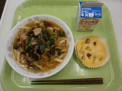 <5年生発案SDGsメニュー> かけきつねうどん ☆さつまいもとりんごの蒸しパン