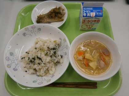 牛乳 菜飯 スケソウダラの香りソースかけ 春野菜の豚汁