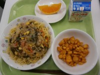 <とれたて村給食の日> 牛乳 コーンライス ✿最上町産アスパラと春野菜のクリーム煮 メロン