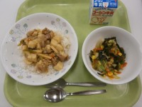 <とれたて村給食> 牛乳 さつま町産ごぼうと鶏のピラフ マカロニスープ さいころ...