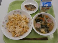 <入学と進級のお祝いの行事食>牛乳 たけのこごはん めばるの西京味噌焼き お祝い...