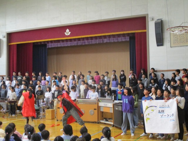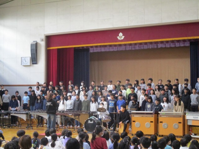 今回のテーマは「明日への一歩」です。昨年度本校は80周年を迎えました。今年は90周年、100周年に向けた新たな一歩を踏み出す年です。「明日への一歩」は6年生が作詞を行い、音楽会で想いを込めて歌いました。