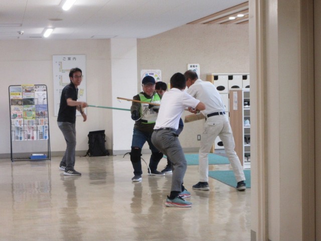 警察の方が不審者役です。不審者との距離を取りながら、教職員が対応していきます。