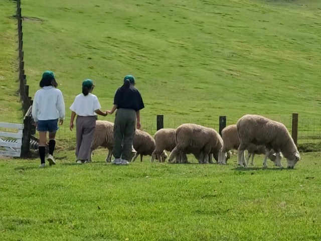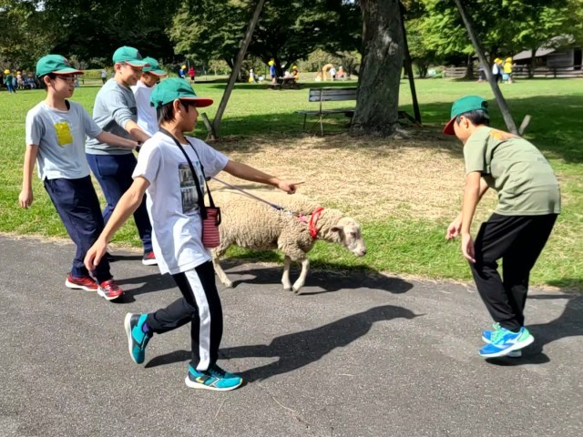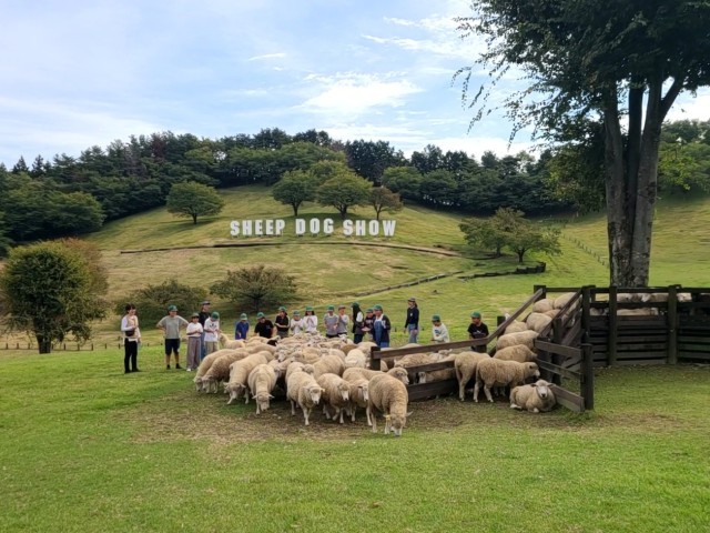 動物の体温に触れて、子供たちは癒されていました。5枚目の写真は、「シープドッグショー」の会場で行いました、牧羊犬のように、人間が指示したらひつじがどのくらい言うことを聞くのか…「ジープ人間ショー」と言わんばかりの貴重な体験をすることができました。