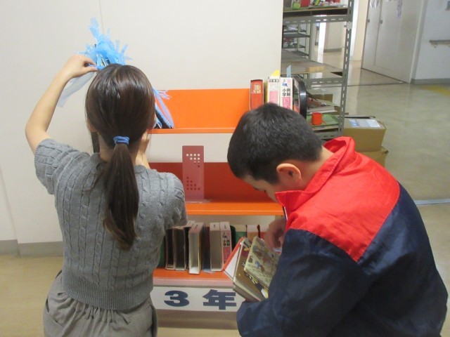 図書委員会の子供たちは、今週から行う「読書旬間」に向けて、準備をしていました。近隣の西台図書館から借りた本に分かりやすく目印を付け、各学年の書架に積んでいます。