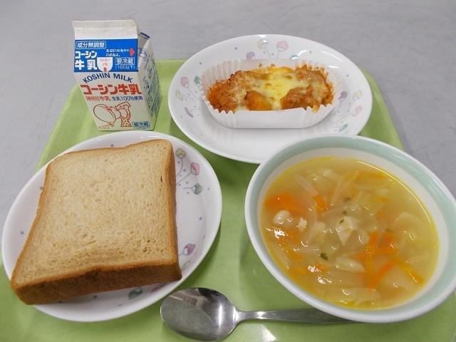 給食ではマカロニグラタン・とうふのグラタン・なすのグラタン・かぼちゃのグラタンなどがあります。今日は、ミートソース味のじゃがいものグラタンです。