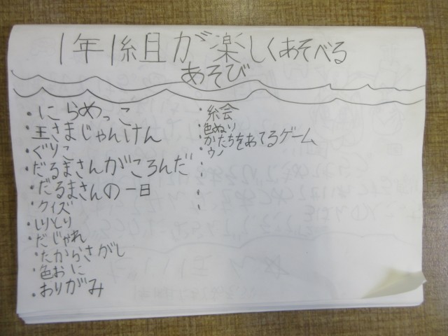 1年生が楽しめるように、準備してきた2年生です。班毎に、名前を伝え合ったり、円になって話し合ったり、実際に遊んだりして、仲を深めていました。