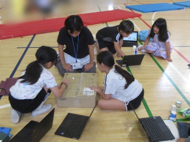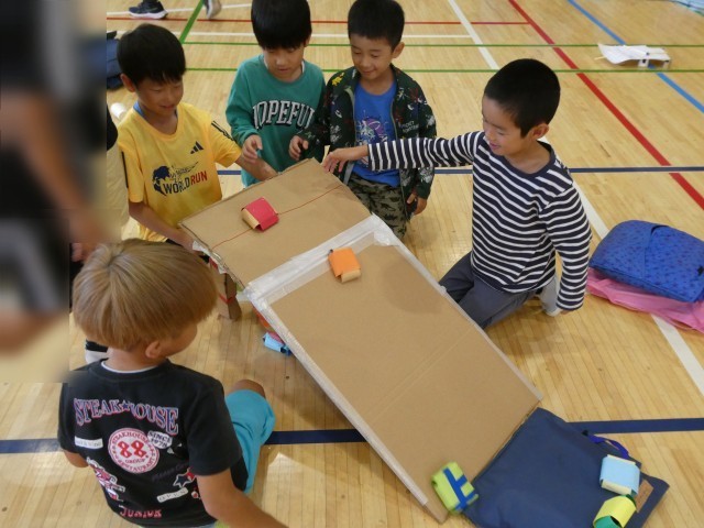 一人一人が作ったおもちゃを他のクラスの子供たちに紹介したり、一緒に遊んだりしました。思い思いに作ったおもちゃのよさや楽しさを伝え合い、クラスの枠を越えて、楽しく遊んでいました。