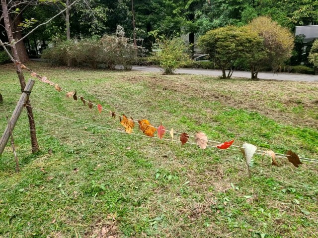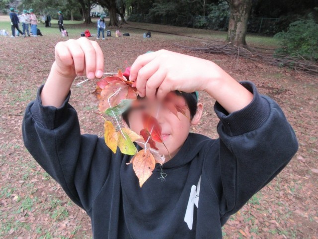 写真は、きょうだい班でお弁当を食べている様子、1年生のどんぐり拾いや2年生のクラス活動の様子です。2年生は、秋の図工の造形遊びにもつなげて、落ち葉のシャワーをたくさん浴びたり、つなげてオブジェにしたりして楽しんでいました。