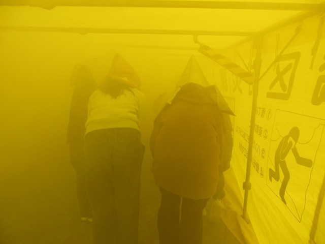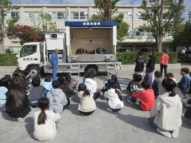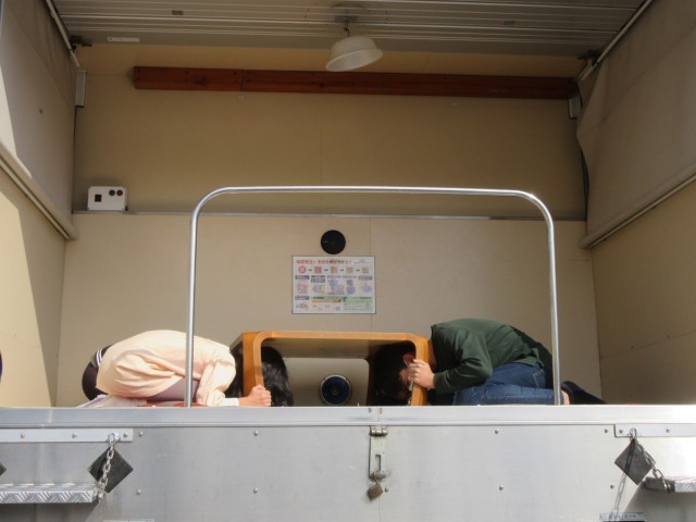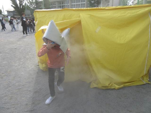 火災の避難訓練のあとは、全校児童対象に煙体験と6年生対象に起震車を使った地震の体験をしました。