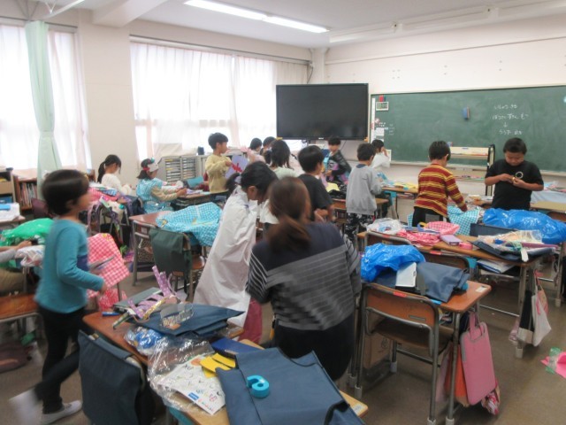 1年生は、ファッションショーで使う衣装を、担当の子供たちが作っていました。カラフルなビニール袋やカラーテープ、画用紙などを使って、装飾していきます。ゲームのキャラクターのように、作った剣を上手に作っている子供もいました。