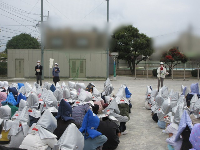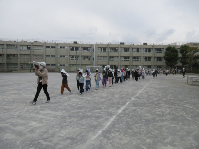 移動中も訓練は続いています…。やや時間はかかりましたが、全校で静かに移動することができました。いつ起きても、どこで起きても、訓練で身に付けたことを忘れずに、自分の身を守る行動をしてほしいと思います。