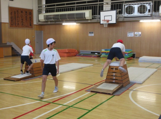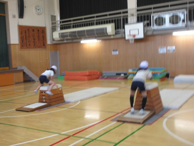 4年1組は、体育館で跳び箱に取り組んでいました。正しいフォームで安全に跳んでいます。写真には写っていませんが、隣では先生の補助のもと、台上前転に取り組んでいました。