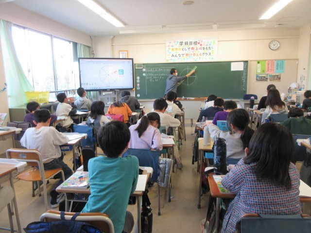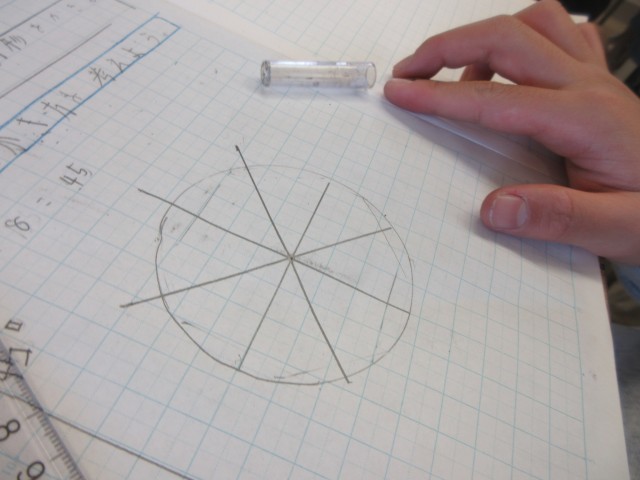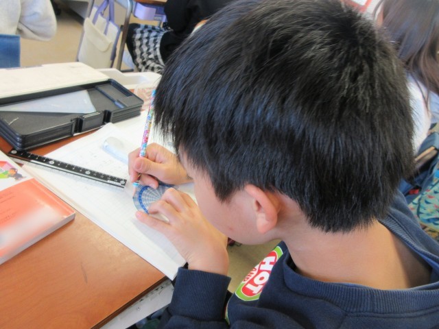 5年生の算数「正多角形と円」の学習です。正八角形をどうやって描いたらいいか、考えていました。今日は、分度器を使った作図です。明日は、コンパスを使って取り組むようです。作図の手順となぜそうなるかという理解が重要になります。反復練習で理解を深めていました。