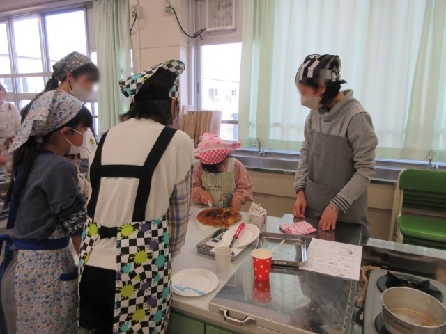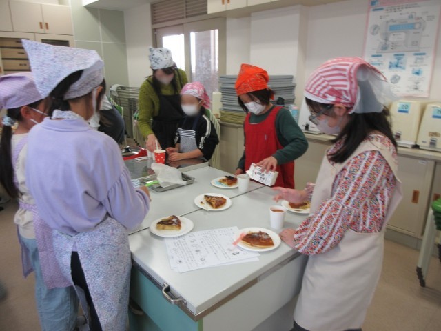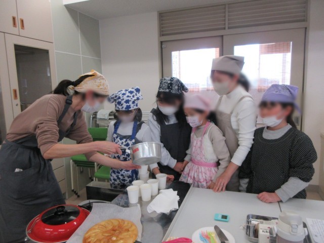 ホームメイドのスタッフの方々や参加したお子さんの保護者方々に見守られ、1年生から6年生までの希望者35名ほどが土曜日の下校後に家庭科室に集まりました。班ごとに協力しながら、楽しくて美味しい時間を過ごしていました。いい香りが漂ってきます・・・。